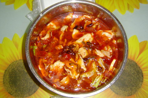 水煮肉片其實是一道川菜,提到川菜大家就應該已經明了了,川菜的唯一特點就是辣。通常選用的食材為豬肉里脊或者瘦牛肉,凍成塊之后再切成均勻大小的肉片。準備好一些蔬菜,可以是白菜、油麥菜、生菜等等。將菜放入熗好鍋中,加水煮熟,然后加入切好的肉片,放入調料,尤其是辣椒醬,煮熟后盛出即可。