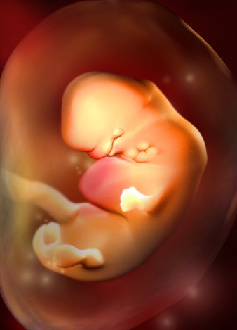 胚胎長約12毫米,大頭與身體不成比例。面部器官已可分辨,眼睛未長成但非常明顯,鼻孔大開,耳朵略凹陷。手、腳及四肢幼芽初成,肌肉纖維和垂體已經發育。此時還聽不到胎心音,但胚胎的心臟已經劃分成左心房和右心室,每分鐘大約跳150下。