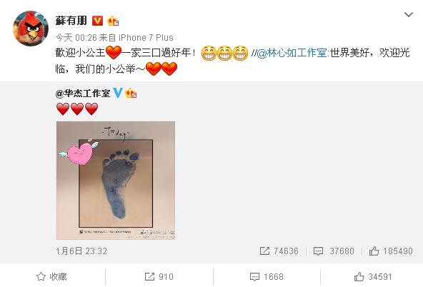 林心如工作室也馬上有默契的轉發,甜甜宣布世界美好,歡迎光臨,我們的小公舉~立刻引來網友驚喜道賀恭喜、超歡迎小公主、替你們感到開心。