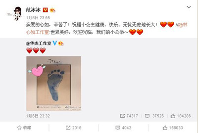 范冰冰:親愛的心如,辛苦了!祝福小公主健康、快樂、無憂無慮地長大!