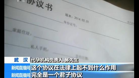 代孕機構負責人 郝先生:這個協議在法律上起不到什么作用,完全是一個“君子協定”。您過來做這件事情,第一肯定是要去多方面了解,信任吧,講求一個誠信。就是說您這邊是需求者,就是想得到一個健康的寶寶,是吧。包括代孕媽媽她做這件事情,也是想順順利利把小孩生出來,她拿這部分傭金,咱們都希望這事情有一個好的結果。