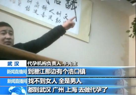 代孕機(jī)構(gòu)負(fù)責(zé)人 牛先生:潛江那邊有個(gè)浩口鎮(zhèn),到那個(gè)鎮(zhèn)上,過(guò)段時(shí)間你去看,找不到女人,全是男人,都到武漢、廣州,去做代孕了。